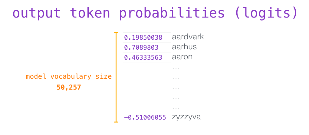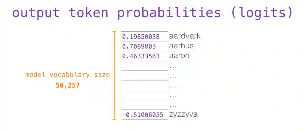 向量可以对于词汇表的每个单词计算一个概率(词汇表是模型能「说出」的所有单词,GPT-2 的词汇表中有 50000 个单词)。