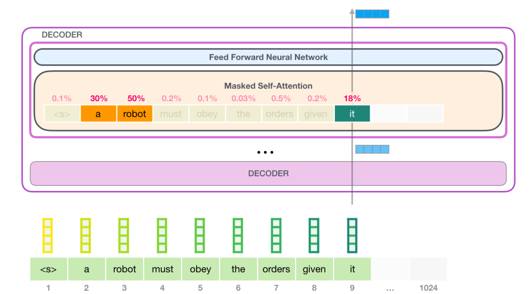 GPT-2 的每一层都保留了它们对第一个单词的解释,并且将运用这些信息处理第二个单词(具体将在下面一节对自注意力机制的讲解中详述),GPT-2 不会根据第二个单词重新解释第一个单词。