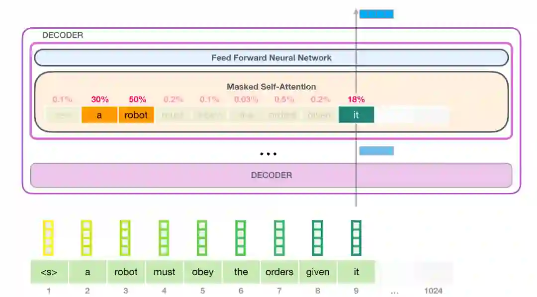 举个例子,最上层的 transformer 模块在处理单词「it」的时候会关注「a robot」,所以「a」、「robot」、「it」这三个单词与其得分相乘加权求和后的特征向量会被送入之后的神经网络层。