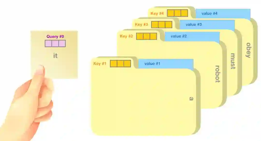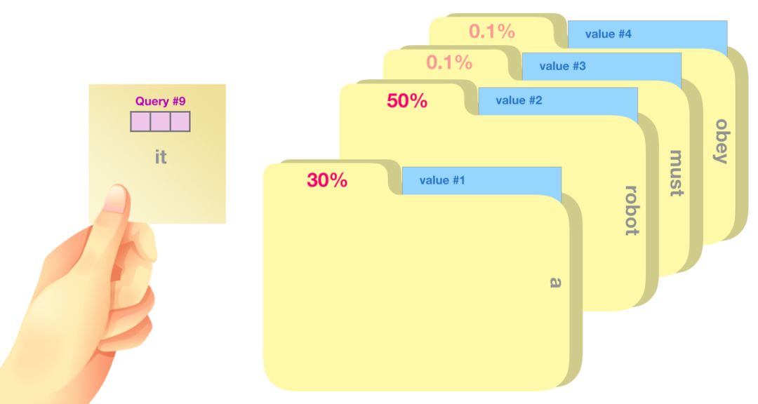 将单词的查询向量分别乘以每个文件夹的键向量,得到各个文件夹对应的注意力得分(这里的乘指的是向量点乘,乘积会通过 softmax 函数处理)。