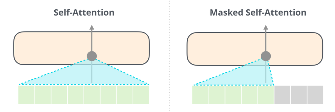 普通的自注意力模块允许一个位置看到它右侧单词的信息(如下左图),而带掩模的自注意力模块则不允许这么做(如下右图)。