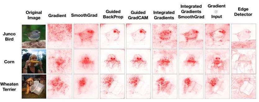 基于梯度的方法说起来也比较简单,其实就是看输入的哪一部分更影响决策。对于一个图片识别模型来说,这种方法就体现在一个saliency map上。也就是将图片的每个像素通过梯度变化的比较,来显示图片的哪些像素是分类器作为分类的依据。但是要注意,我们在这里没有讲到的是解释性的评价。对于saliency map来说,有一个被证实的偏见是来自于我们人类本身,它就是Confirmation Bias。这种偏见就是说,我们即使用这种方式看到了这些明显的像素对于决策占比很高,只是迎合了我们人类的理解,而实际上它并没有反映出它是模型决策的证据。这个结论也是kim团队做出的一项对于saliency map的检查。他们发现,即使把神经网络的每一层的输入随机化,许多模型的saliency map仍然是一个对于人类可识别的轮廓或形状,而理论上讲,打乱神经网络的各个层的输入和输出,这个模型只是一个随机的混乱预测,不应该找出人可以理解的证据的。于是随后推出了一些benchmark来评价可解释性的可靠程度。