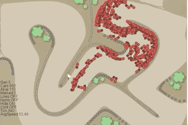 这是一个简单的网络,具有固定数量的隐藏节点(没有NEAT),并且没有偏差。然而经过短短几代的训练后,它已经能成功让汽车快速安全地行驶。