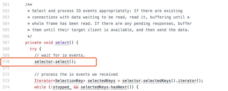 从堆栈信息可以看到触发点位于 Thrift 的 TThreadedSelectorServer.select() 方法中,查看源码可知其不过是调用了JDK Selector.select() 方法。(注:为描述方便笔者把实例方法调用使用类方法调用形式展示)