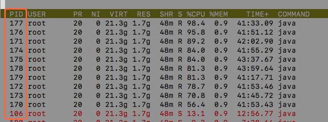 按 cpu 使用量排序后,发现前面几个线程 cpu 使用量接近 100% 。 Java 程序快用 jstack 查看这个线程在干嘛吧,定位到 pid=177 ( 0xb1 ) 的线程堆栈信息如下: