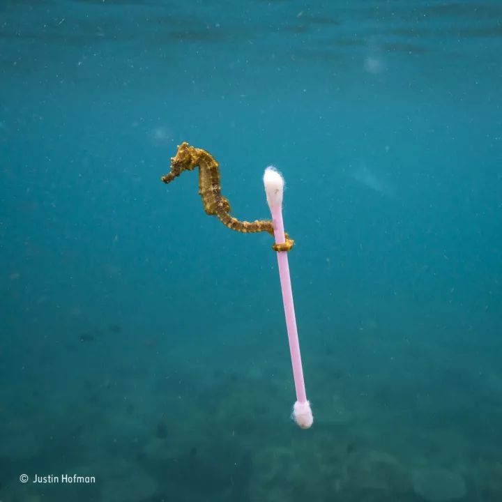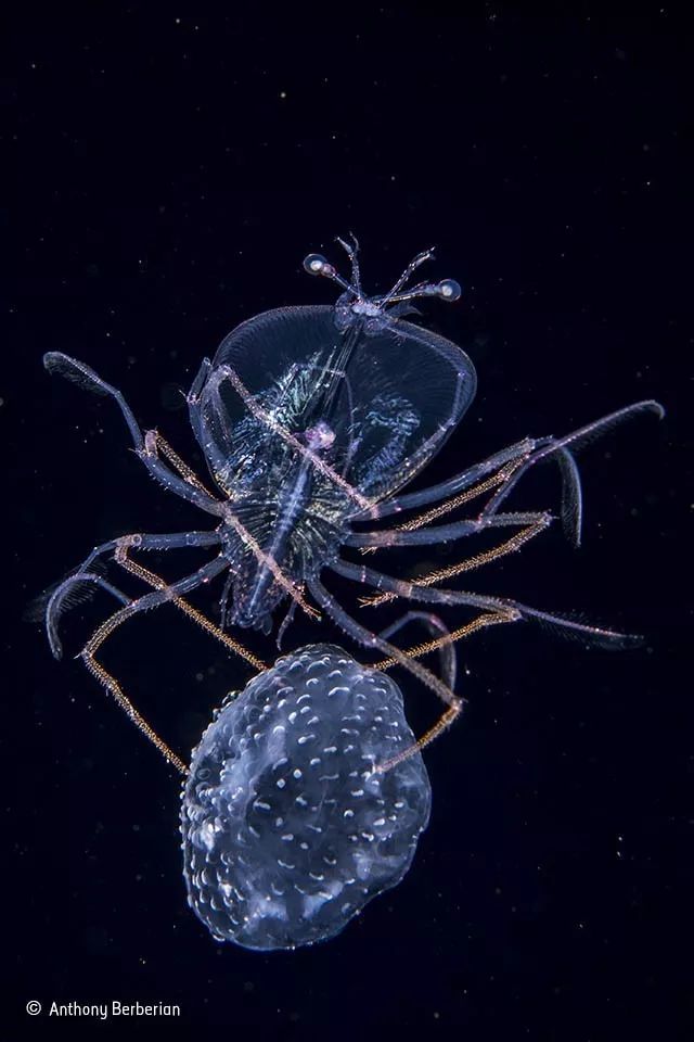 这张照片被命名为《水母骑师(The jellyfish jockey)》。抓着水母的是一只海鳌虾幼体,它只有一厘米多长。这个小家伙幸运的捡到了一个死水母,它可能吃掉了水母的触手,正抱着其身体漂流。