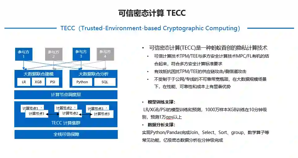 为此,蚂蚁集团在可信隐私计算技术框架下首创可信密态计算技术,(Trusted-Environment-based Cryptographic Computing,简称 TECC),将可信计算技术 TPM、TEE 与多方安全计算技术 MPC、联邦学习 FL 有机的结合起来,符合多方安全计算标准要求,有效抵抗困扰 TPM、TEE 的供应链攻击、侧信道攻击问题。