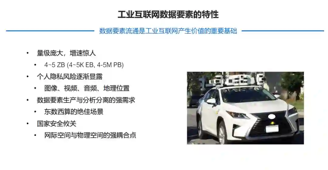 我们可以在一些高科技地区看到很多自动驾驶公司实验车辆出没,这些车上顶着各种各样的探头,各种各样的传感器,这种传感器其实是把周围的人和环境,和这些工业互联网的数据耦合在一起。这些传感器数据的重要性也逐渐被广泛关注,如果缺乏相关安全管控,甚至可能引发国家安全相关问题。
