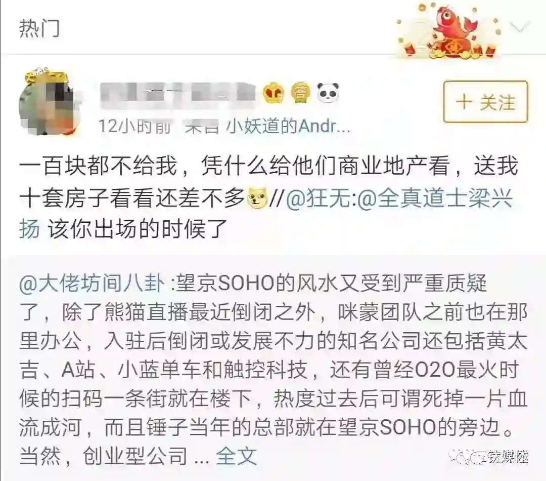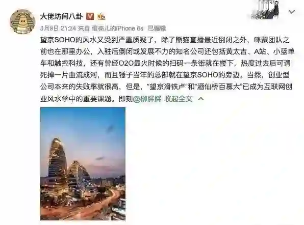 3月9日,微博博主“大佬坊间八卦”发了一条微博,谈论入驻望京SOHO后倒闭或发展不力的互联网公司。