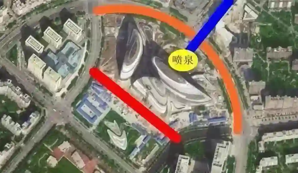 我们还可以看到,为了缓解路冲煞,设计师在望京SOHO建了一个喷泉,但是奈何煞气太冲,不能根本杜绝。