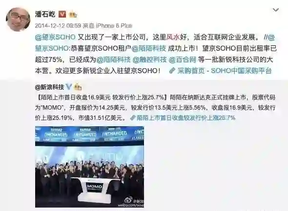 在2014年陌陌上市时,潘石屹难言心中的喜悦发微博称,“又出现了一家上市公司,这里风水好,适合互联网企业发展。”而此时的望京SOHO的出租率已经超过75%,且多为互联网公司。
