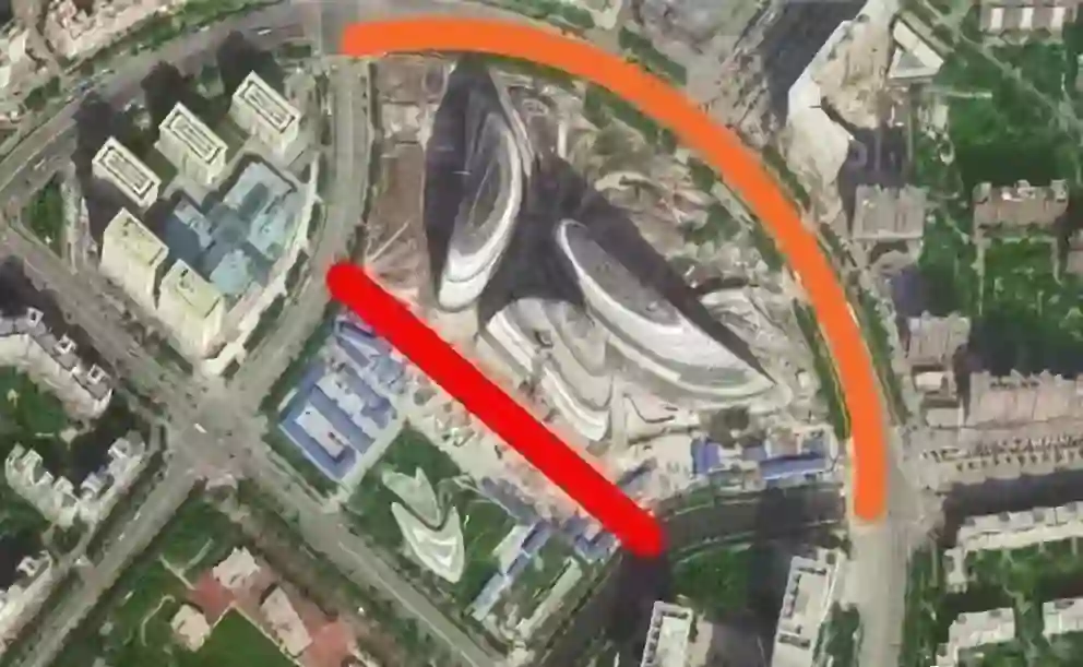 除此之外,在望京SOHO两侧有两个反弓煞,煞气是直对大楼,在红线所示的通道形成大煞。
