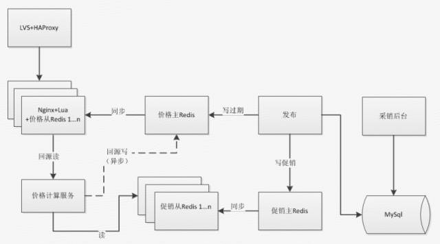 1)写逻辑流程:当采销在后端调整价格或建立促销时,同步写入 MySQL 数据库,然后通过异步任务更新促销主 Redis 数据,并同时更新价格主 Redis 的过期时间戳,通过 Redis 自身复制机制,将数据传播到从节点。2)读逻辑流程:当用户在前端浏览商品列表、详情等页面时,异步访问价格实时服务,此时内嵌 Nginx 的 Lua 程序直接读取本地 Redis(从)中的价格数据,无过期则直接返回用户;若过期或不存在,则回源访问价格实时计算服务,即刻返回最新价格给用户。3)回源写逻辑:价格实时计算服务读取促销主 Redis,在返回最新价格给用户的同时,异步写价格主 Redis 集群,价格主 Redis 同步数据至前置 Nginx 节点的从 Redis 节点。