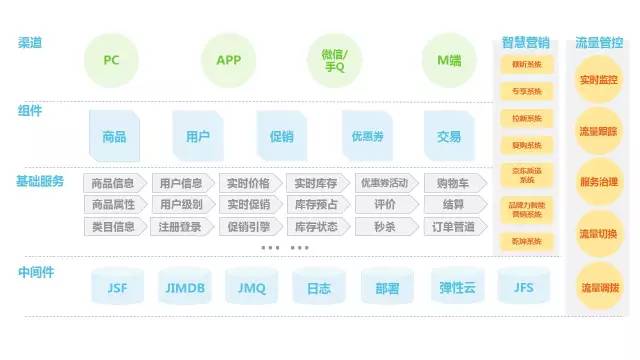 王晓钟: 目前交易平台主要依据业务能力来划分服务的:购物车、结算页、促销、价格、库存、商品、用户等,为 PC,手机,微信等渠道提供高可靠的大中台服务。