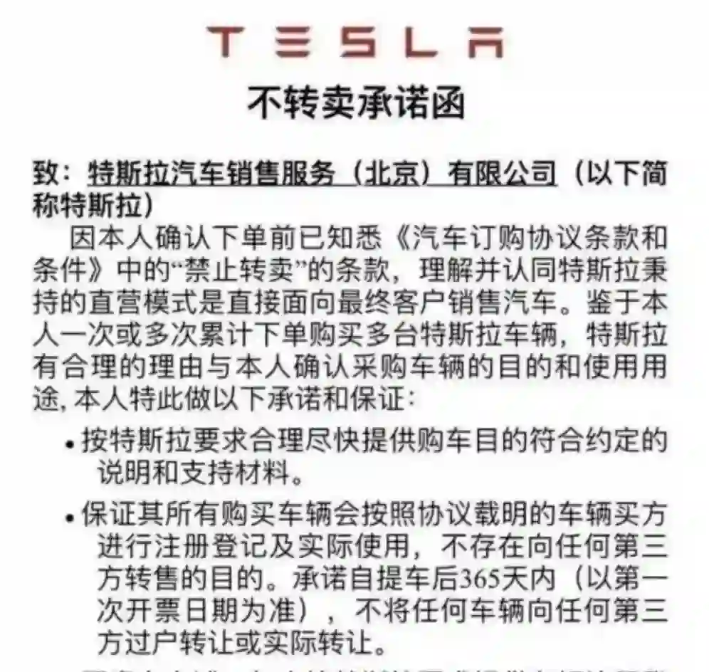 特斯拉官方表示,公司已要求累计下单购买多台特斯拉车辆的车主,签订 《不转卖承诺函》,承诺一年内不得向第三方转售,违者按车辆开票价20%支付违约金。