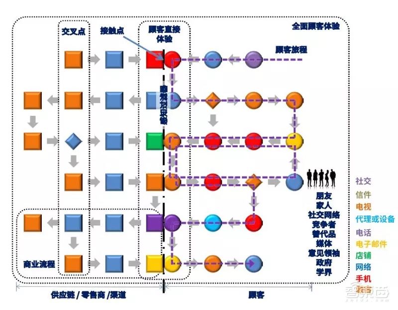 正如下图例证所示,零售生态中的参与者有很复杂的互动关系。除了接触点,识别出覆盖多个接触点和流程(我称其为“交叉点”),面向顾客进行重复性活动及支持数据,也非常重要。包括客户关系管理、安全隐私、品牌标识、欺诈识别等。而且研究表明,针对流程或两个接触点交叉的地方,关注顾客旅程的零售商,财务表现有显著提高。