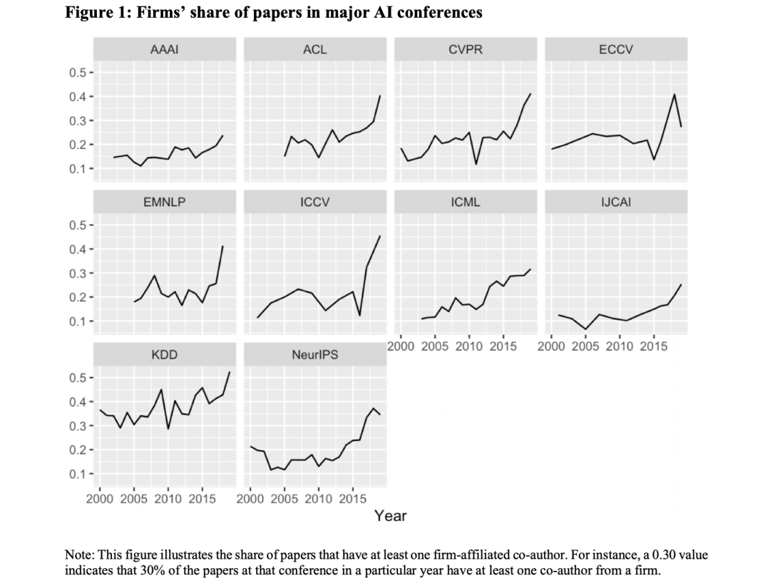 自2012年深度学习的意外增长以来,公司,尤其是大型技术公司和精英大学增加了对主要AI会议的参与;这里的精英大学指的是在QS世界大学排名中排名1-50的大学;