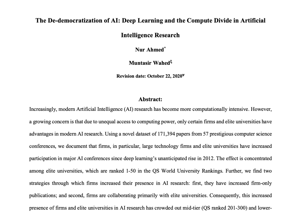 ir Wahed在一篇题为《人工智能的去民主化:人工智能研究中的深度学习和计算鸿沟》的论文中表达了对于“深度学习垄断”的看法。这篇论文最近发表在arXiv上,并于10月底在战略管理学会(Strategic Management Society)一个商业研究研讨会上发表。