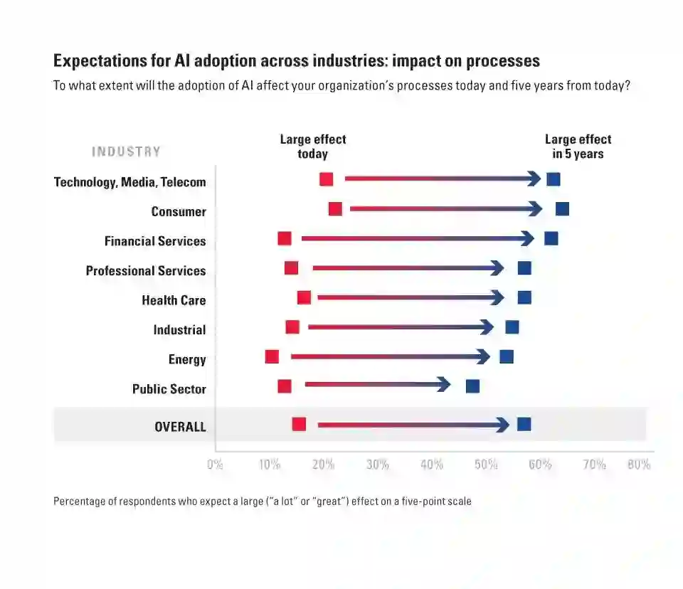 图说 | 各行业 AI 采用程度: 对工作流程影响程度(来源:MIT Sloan Management Review)
