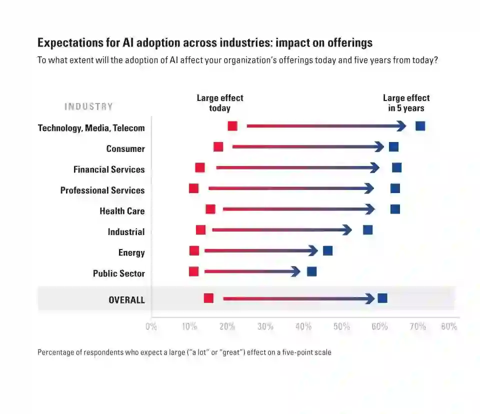 图说 | 各行业 AI 采用程度: 对产品服务影响程度(来源:MIT Sloan Management Review)