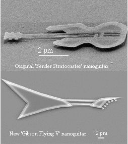 几年前康奈尔大学的科学家们制造了世界上最小的吉他(上图),大小大概等于一个血红细胞。其实严格地说纳米吉他不算单个分子。