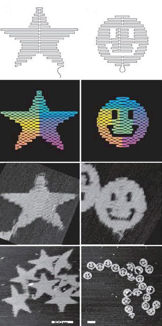 DNA可以做成不同形状的纳米折纸。图片中用DNA做的的星星和笑脸大约只有100纳米那么大。科学家还用DNA画出了下面的纳米信和纳米世界地图。
