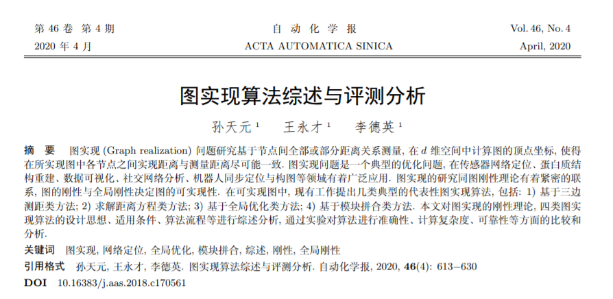 摘要: 图实现(Graph realization)问题研究基于节点间全部或部分距离关系测量, 在d维空间中计算图的顶点坐标, 使得在所实现图中各节点之间实现距离与测量距离尽可能一致.图实现问题是一个典型的优化问题, 在传感器网络定位、蛋白质结构重建、数据可视化、社交网络分析、机器人同步定位与构图等领域有着广泛应用.图实现的研究同图刚性理论有着紧密的联系, 图的刚性与全局刚性决定图的可实现性.在可实现图中, 现有工作提出几类典型的代表性图实现算法, 包括: 1)基于三边测距类方法; 2)求解距离方程类方法; 3)基于全局优化类方法; 4)基于模块拼合类方法.本文对图实现的刚性理论, 四类图实现算法的设计思想、适用条件、算法流程等进行综述分析, 通过实验对算法进行准确性、计算复杂度、可靠性等方面的比较和分析。