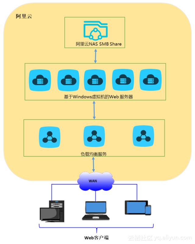 很多用户选择使用阿里云独享型Windows ECS来提供网站服务,通过将网站内容资源集中存储阿里云NAS文件系统上,IIS可以和访问本地文件系统一样访问阿里云NAS上的数据,从而帮助用户网站服务实现存储和计算分离,同时计算资源和存储资源能够按需弹性扩展, 通过阿里云负载均衡服务搭建一个弹性容错的网站架构。如图所示: