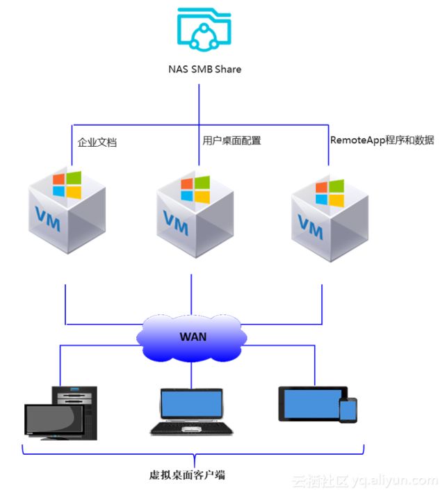 下图显示了Windows环境虚拟桌面通过阿里云NAS共享数据的场景。