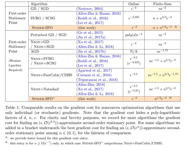 1. 对于一个更难的收敛准则,即要求算法能够逃离较明显的鞍点,找到一个二阶稳定点,本文提出了 SPIDER-SFO 算法,其收敛速度仍为ɛ的负 3 次幂。而目前所有非凸方法对于寻求二阶稳定点只能达到ɛ的负 3.5 次幂的收敛速度!下图为给算法之间的收敛速度比较: