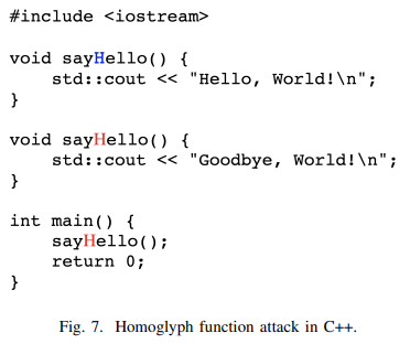 研究人员还展示了如何在 C++ 中执行同源文字攻击。他们使用了两个看起来相似但实际上不同的 H,蓝色的拉丁语 H 和红色的西里尔字母Н。当进行编译时,该程序输出文本「Goodbye, World!」。