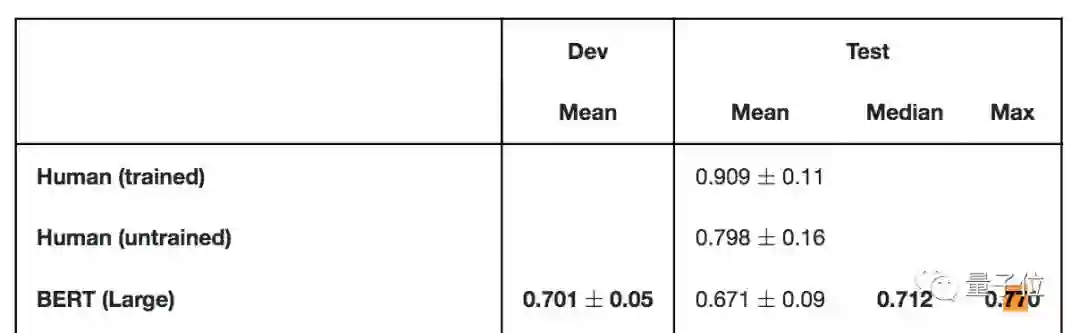 原本,BERT在这个数据集上表现优良,77%的最好成绩,只比未经训练的人类 (79.8%) 低不到3个百分点。