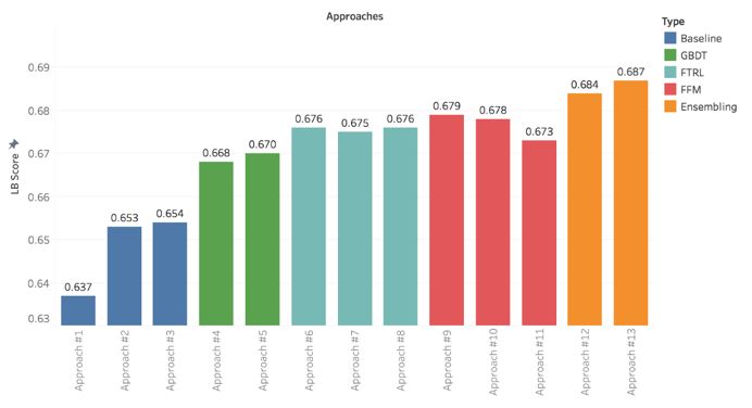 我考虑了在Kaggler FTRL平台上训练模型的所有分类特征。特征交互选项被启用,这意味着对于所有可能的成对的特征组合,特征值增多并哈希(请阅读第一部分的特征哈希)到一个具有维度为2²⁸的稀疏特征向量的位置。这是我运行最慢的一个模型,训练时间花了超过12个小时。但是通过该方法(方法6),我的排行榜分数跃到了0.67659。