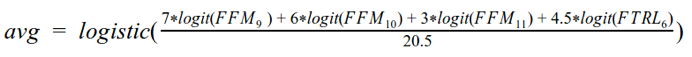 我能找到的最好的方法是利用如式1所示的预测的CTR(概率)的logit(sigmoidal logistic的倒数)的加权算术平均值。它考虑了三个选定的FFM模型(方法9、10和11)以及一个FTRL模型(方法6)的预测。此平均值在方法12中让我得到了0.68418的LB得分,与我最好的单一模型相比(方法10,得分为0.67932),这是一个不错的跳跃。