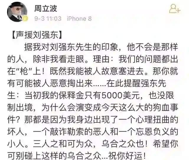 周立波不愧是脱口秀出身,他的声援直白生动,他说两个人都栽在了枪上,波波被人把枪塞到了包里,刘强东被人把枪掏了出来。两个被枪所困的男人,在这一刻显得惺惺相惜。只不过,涛涛在美国还有军军惦记着,而东哥只有警局惦记着。