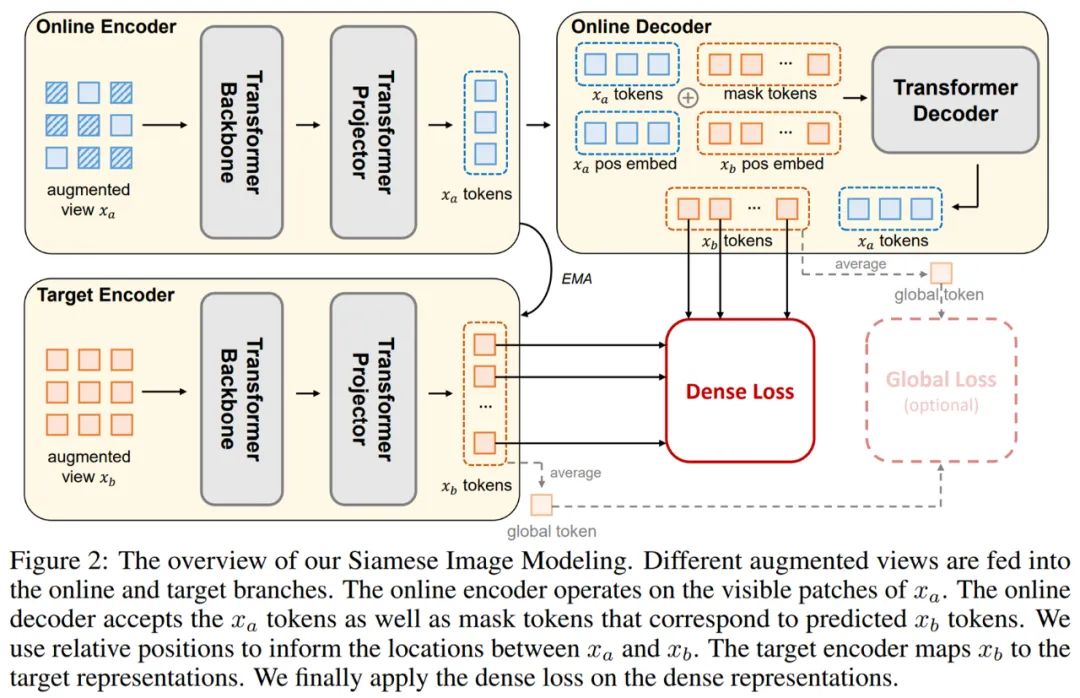 研究者提出了 Siamese Image Modeling(SIM),该方法通过一张遮盖的增强视图来预测相同图像的另一张增强视图的密集特征表示。为了达到这个目标,SIM 采用了孪生网络结构,该结构包含 online 和 target 两个分支。Online 分支首先将第一张遮盖视图映射到特征空间,然后基于第一张图的特征和第一、二张图的相对位置坐标来预测第二张图的特征;Target 分支则负责将第二张图映射到特征空间来获得目标特征。