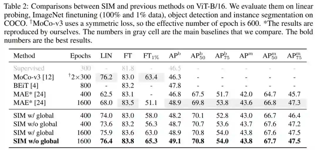 通过这种方式,SIM 能够分别在线性分类任务上和 ID 方法持平,以及在检测任务上和 MIM 方法持平,研究者进一步发现即便没有全局的损失函数,SIM 也能给出很好的线性分类表现。