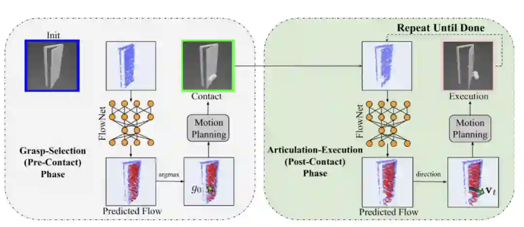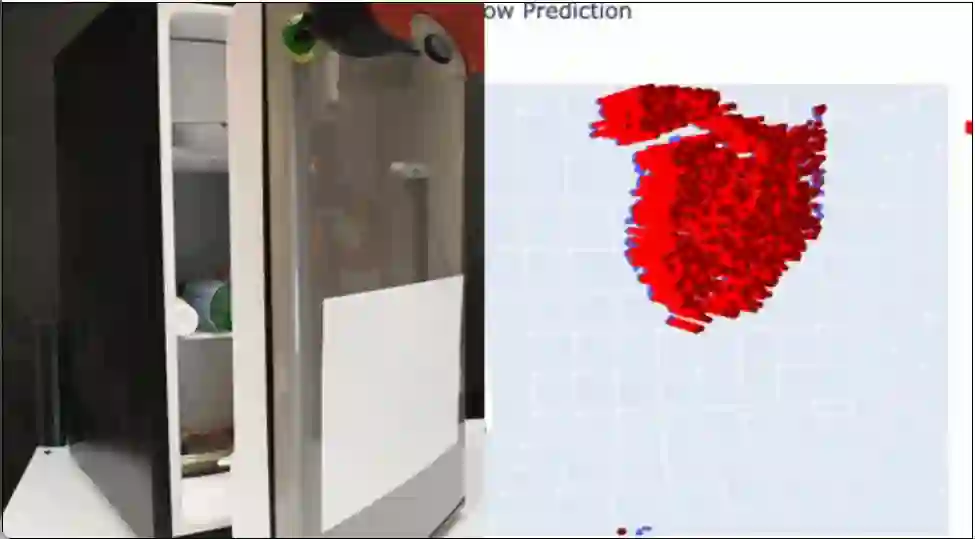 第一个部分是感知部分,这个部分使用 3D 深度神经网络从被操纵家具物体的点云数据中预测三维瞬时运动轨迹。算法的第二个部分是策略部分,它使用预测得到的 3D Articulated Flow 来选择机器人的下一个动作。