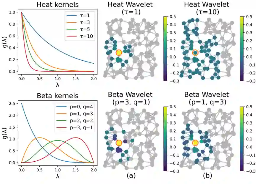 热核小波与 Beta 核小波在谱域(左)和空域(右)上的对比,Beta 函数具有更好的带通与局部性质。