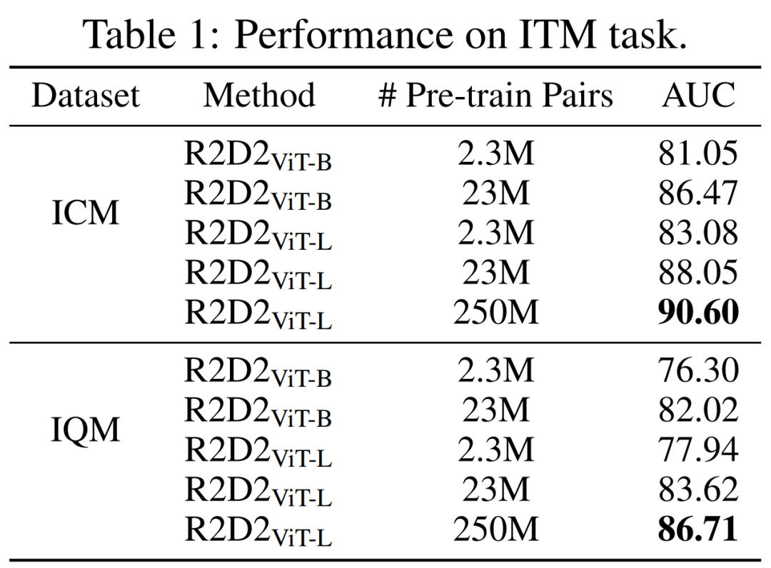 进一步,研究者们还提出了一个视觉语言预训练框架 R2D2,用于大规模跨模态学习,基于所提出的 Zero-Corpus 数据集进行预训练,并在多个下游任务上进行测试,R2D2 取得多项超越 SOTA 的结果。上述数据集和模型,均已开源。