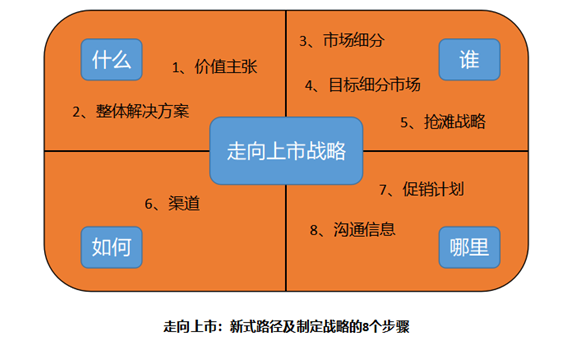 则是一个迭代的过程,将走向上市的战略分为四个象限,分别是产品出售的是什么,向谁出售产品,在哪里进行产品促销,如何将产品推向目标市场。制定走向上市的八个步骤分别是价值主张、整体解决方案、市场细分、目标细分市场、抢滩战略、渠道、促销计划、沟通信息。