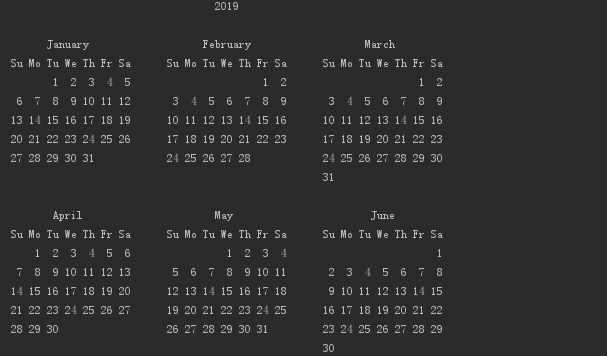 print(calendar.calendar(2019, w=2, l=1, c=6))