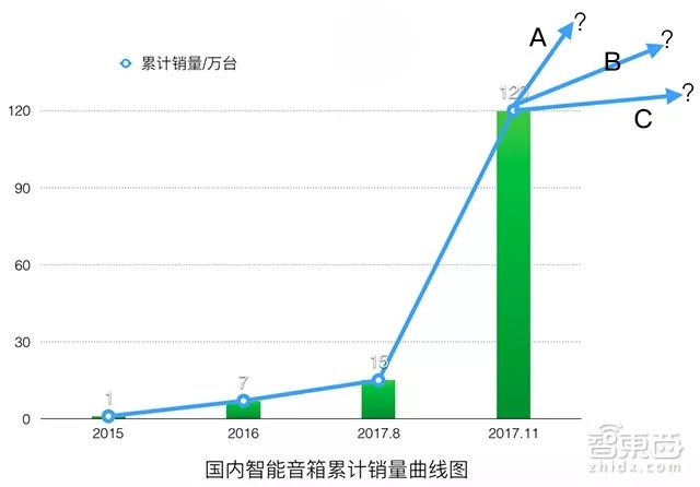 结合亚马逊Echo的增长曲线以及国内智能音箱累计销量曲线图,并结合我国围绕智能音箱的补贴、产业链的成熟度、刚需场景的探索,智东西针对未来1年走势做出以下ABC三种判断,其中A、C两个方向最有代表性。