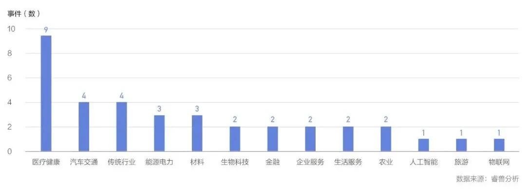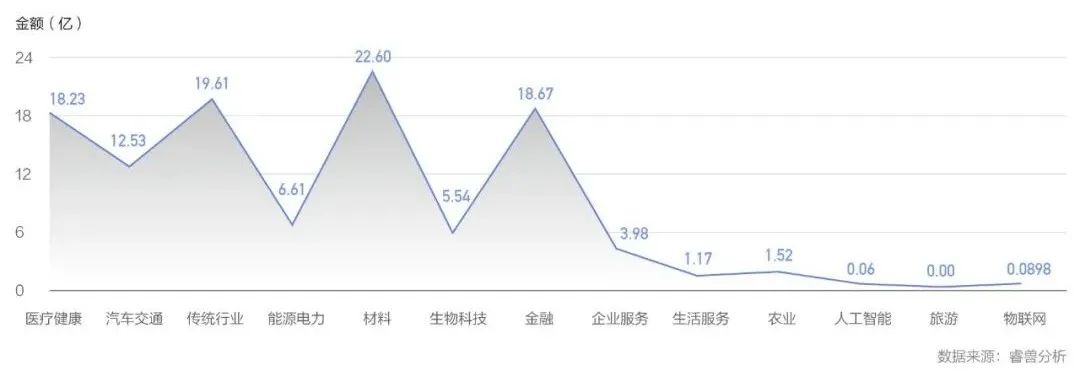 从被并购企业所在行业来看,CVC参与的并购事件共集中在15个行业,从数量来看,排名前三的行业为:医疗健康(9个)、传统行业(5个)及汽车交通(4个);从交易金额来看,排名前三的行业为:传统行业(84.08亿元)、材料(22.60亿元)及金融(18.67亿元)。