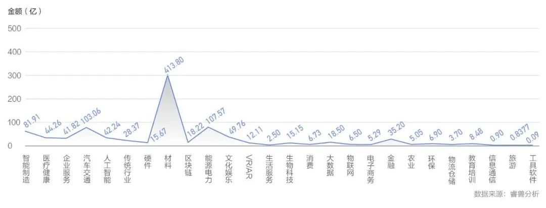 睿兽分析数据显示,2022年第三季度国内CVC投融资市场主要分布在智能制造、医疗健康、企业服务、汽车交通、人工智能等26个行业。其中,智能制造、医疗健康、企业服务分别以50、42和23个投资事件位列第三季度CVC机构追捧的热门行业前三甲。前三行业涉及已披露总金额为167.99亿元人民币,占所有行业33.5%。已披露交易金额前三的行业依次为材料(413.80亿元)、能源电力(107.59亿元)和汽车交通(103.06亿元)。