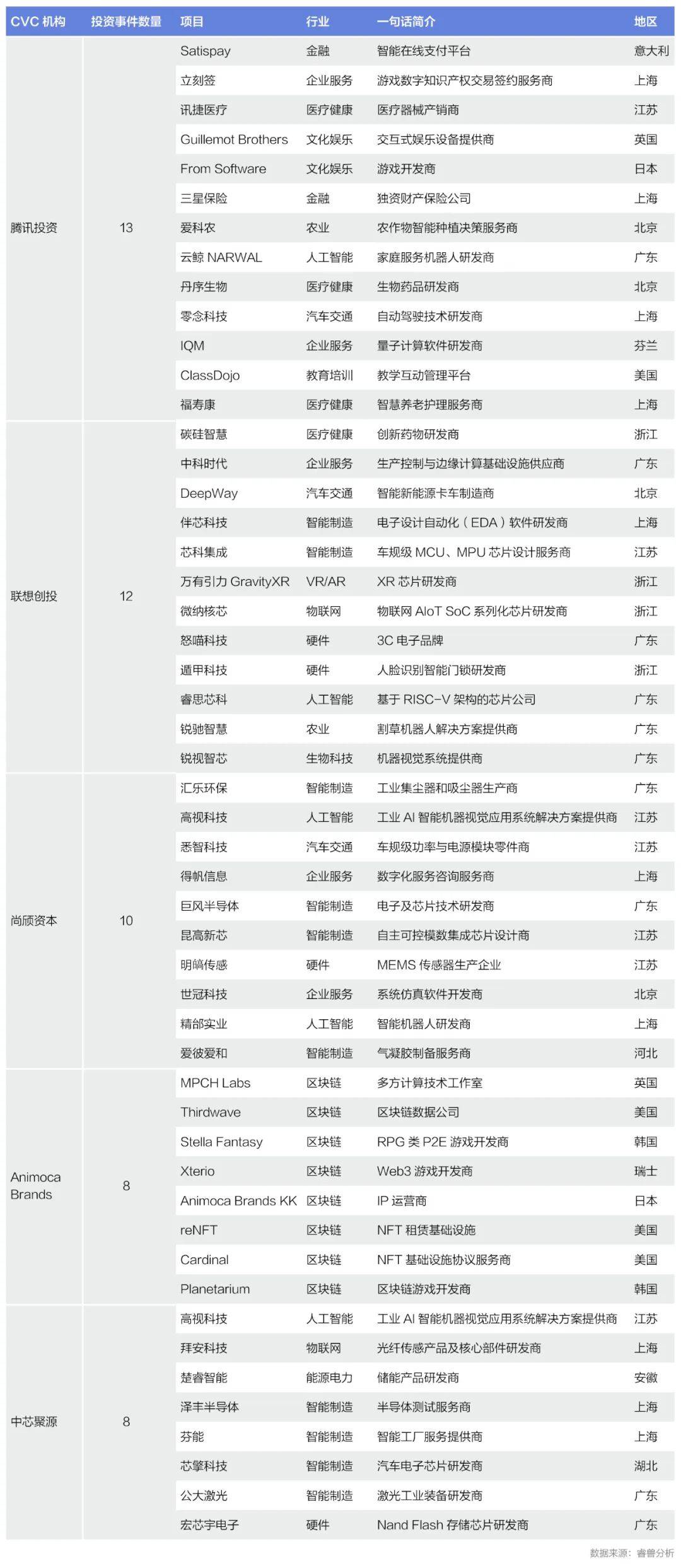 本季度,从投资事件数来看,投资活跃的CVC机构主要为:腾讯投资(13个)、联想创投(12个)、尚颀资本(10个)、Animoca Brands(8个)、中芯聚源(8个)。