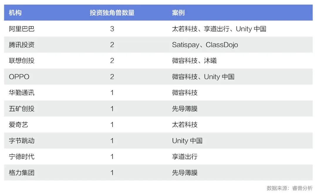 在对本季度14家新晋独角兽企业的投资战绩中,投出独角兽公司数排名前三的CVC机构为:阿里巴巴(3个)、腾讯投资(2个)及联想创投(2个)。