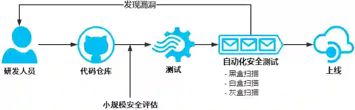 在百度,我们将这种方式称之为轻量级 SDL,即通过少量的人力投入,以高自动化、高 CI/CD 集成的方式解决业务产品的安全问题。在轻量级 SDL 建设初期,我们根据实际业务场景,构建了百度的自动化漏洞检测系统,并将其嵌入到业务测试上线流程中,具体图示如下: