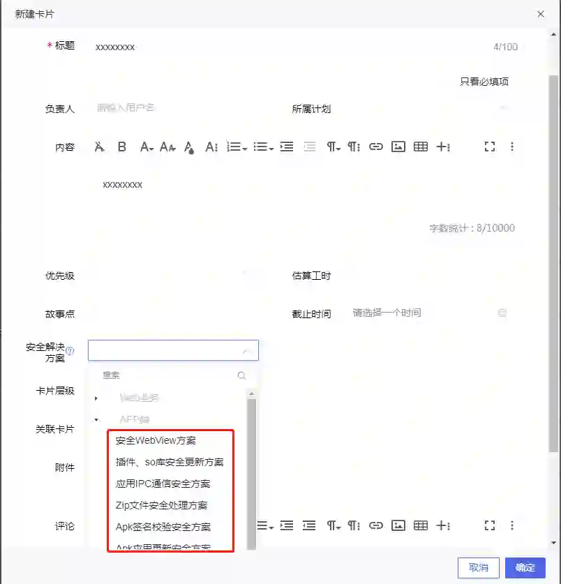 同时将其集成到百度工程规范指定的需求管理产品 iCafe(对外版本)中。当业务线研发人员、PM 创建需求卡片时,可以根据自身的业务场景选择对应的安全解决方案,并在研发前完成规范、安全方案的学习,从而在研发编码阶段尽可能避免这些问题。