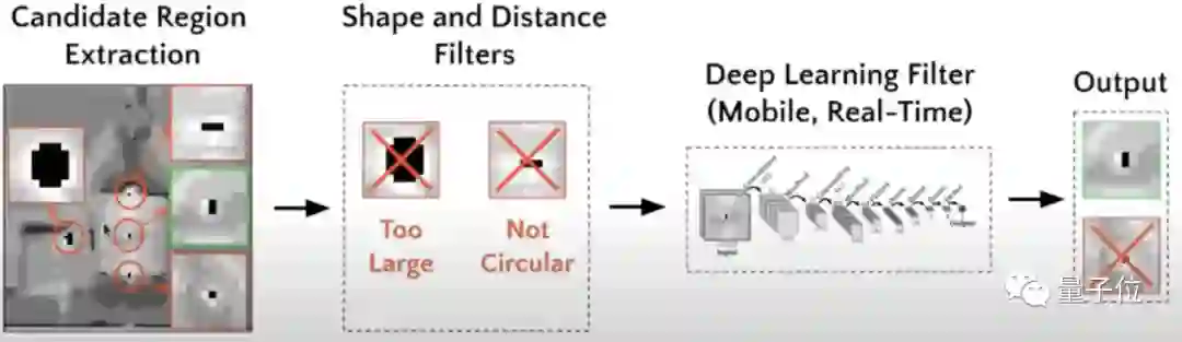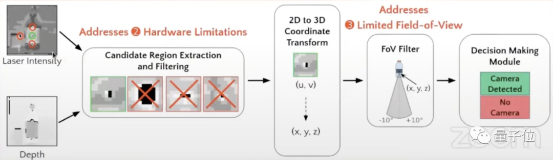 在扫描过程中,ToF传感器的每一帧都给我们提供了激光强度图像和深度图像,程序将两者结合,提取候选区域,然后根据物理知识和机器学习过滤掉形状和距离基本不可能的选项。
